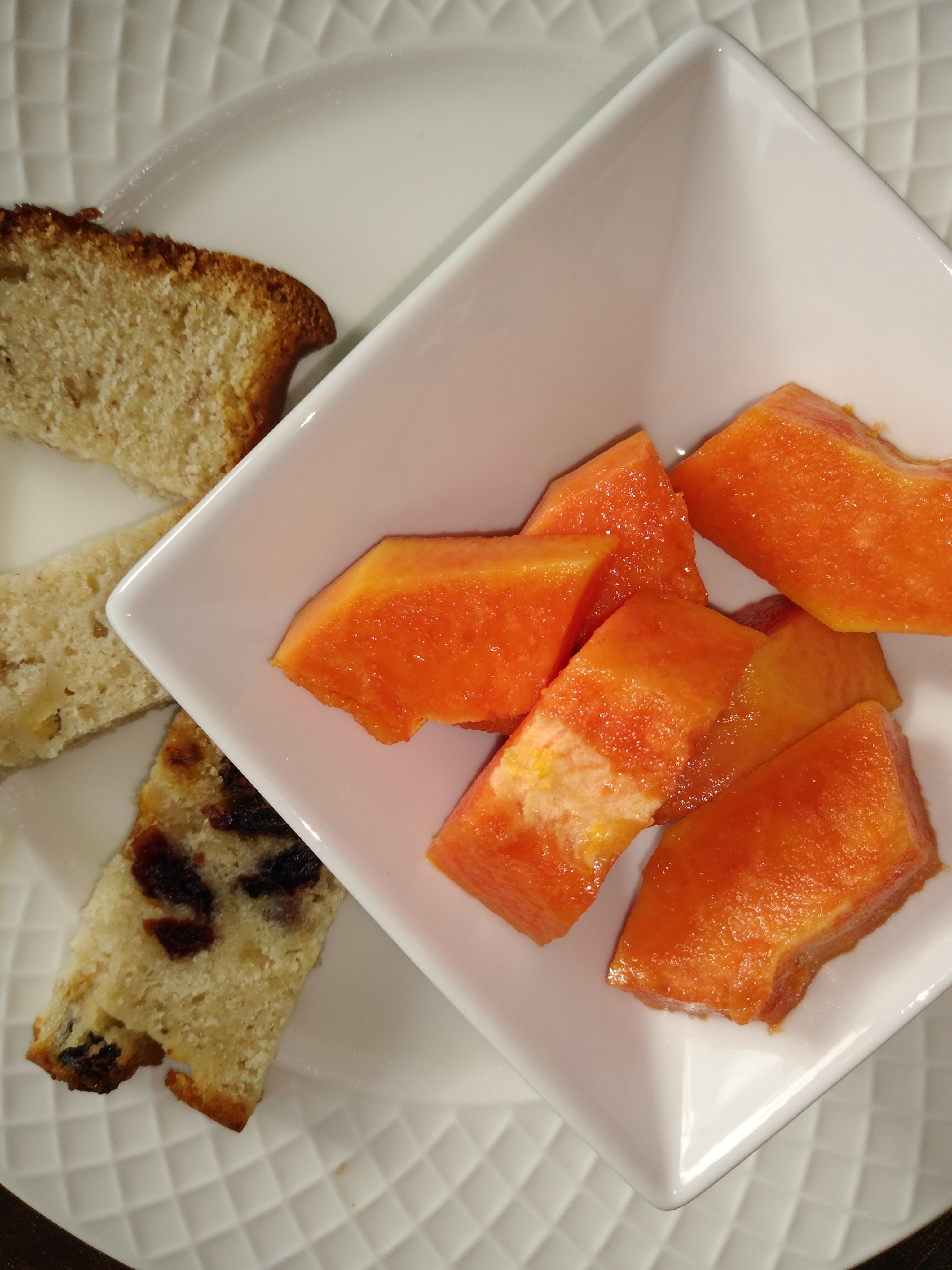 Sliced Banana bread and Tropical Fruits Choices
