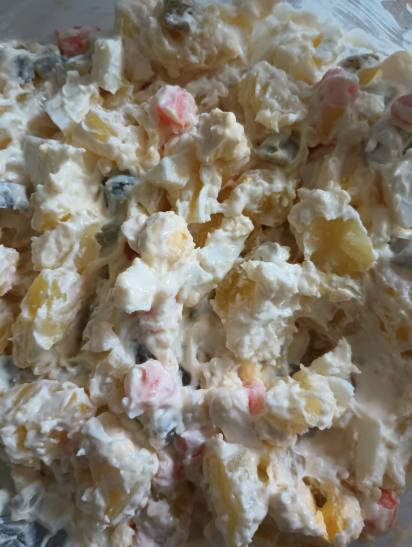 Cooked cut-up 5 potatoes, shredded carrots or cut-up baby carrots, cut-up 3 boiled eggs, 3 pickles. Add 1c. real mayonnaise, stir and serve.
